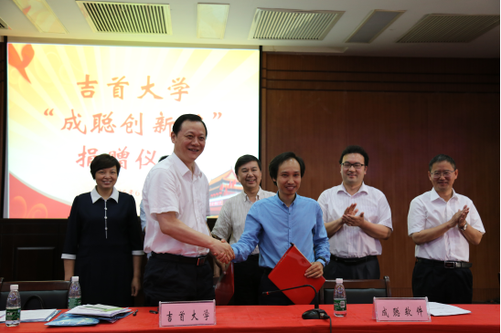 6月17日下午,在吉首大学创新创业教育工作大会上,成聪软件董事长于成聪向母校吉首大学捐赠人民币一百万元设立“成聪创新奖”,以激励更多在校学生投入到“创新创业”中来。学校相关领导,各学院、各职能部门主要负责人及就业创业教研室全体老师、学生代表及成聪软件部分员工出席大会,见证了这一历史时刻。